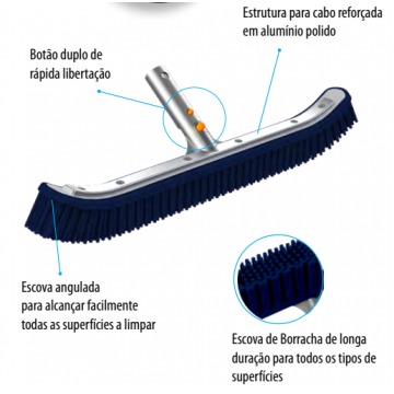 O formato curvo permite alcançar todas as superfícies da piscina com facilidade, incluindo cantos e áreas de difícil acesso. Compatível com hastes telescópicas padrão e equipada com sistema de botão duplo, permite uma troca rápida da vara para uma utilização simplificada.