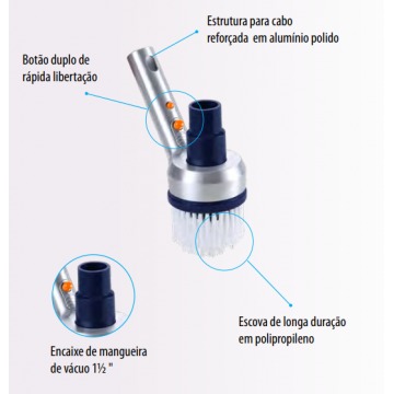 As cerdas são estrategicamente posicionadas nas extremidades do formato angular para remover sujeira acumulada nesses pontos críticos. Compatível com varas telescópicas padrão e equipado com sistema de botão duplo para libertação rápida, este acessório torna-se muito prático e versátil.
