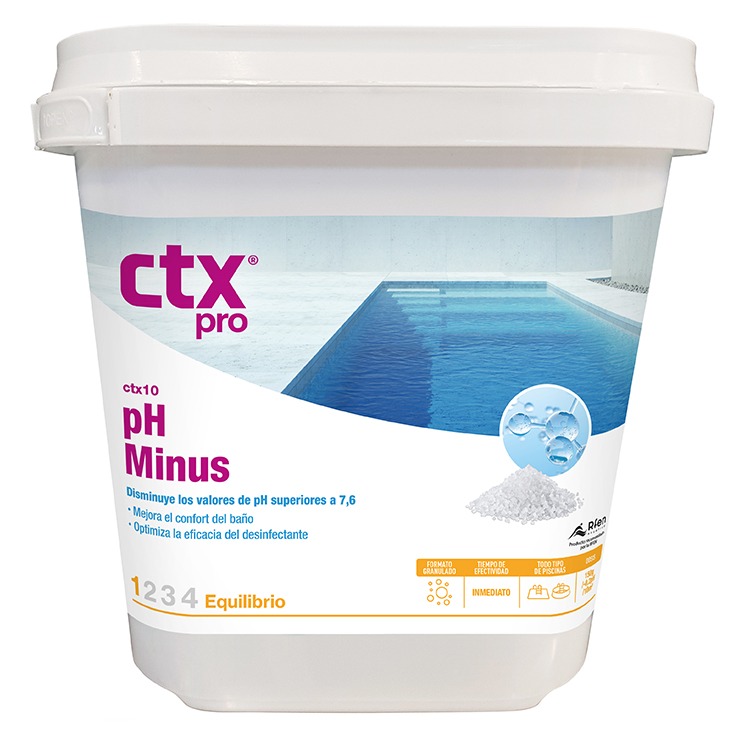 PH de pH granulado CTX-10 para reduzir o pH entre 7,2 e 7,6 quando este for maior do que 7,6. Antes de realizar qualquer tratamento da água da piscina, é essencial para controlar o pH, caso contrário, o desinfetante não vai agir corretamente. Os sintomas de um pH elevado são água turva, irritação da membrana mucosa, destruição da camada protetora da pele e formação de depósitos calcários na piscina.