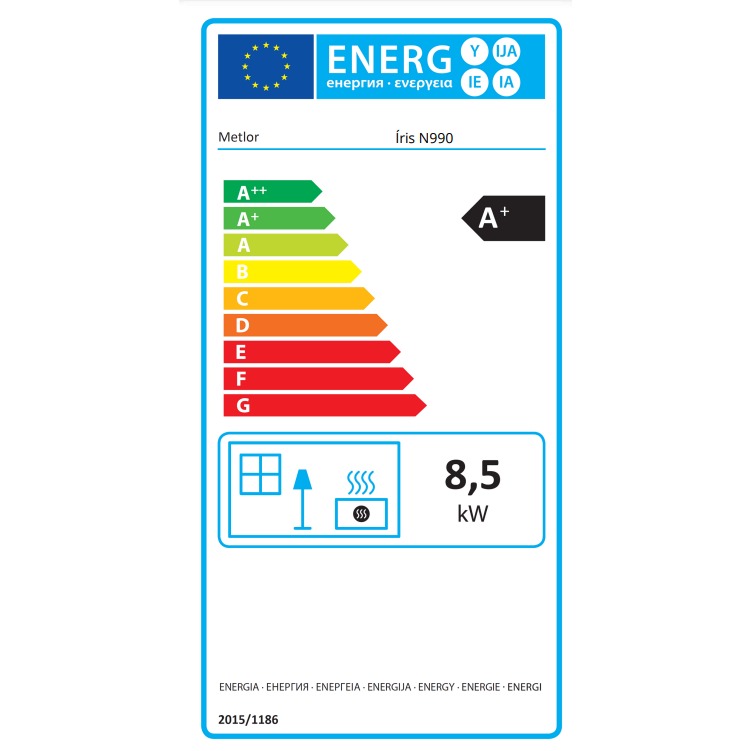A Íris N990 é uma salamandra a lenha com forno com uma potência de 8,5kW, prática e de fácil utilização. É fabricado em chapa de aço de 4 mm. Com um vidro Neocerâmico de 4 mm de espessura e com uma amplitude térmica até 900⁰C. Na pintura é utilizada tinta especializada para equipamentos de temperatura elevada até 900⁰C. Todas as peças inerentes ao aparelho são em aço. O forno é equipado com um termómetro até 400ºC.